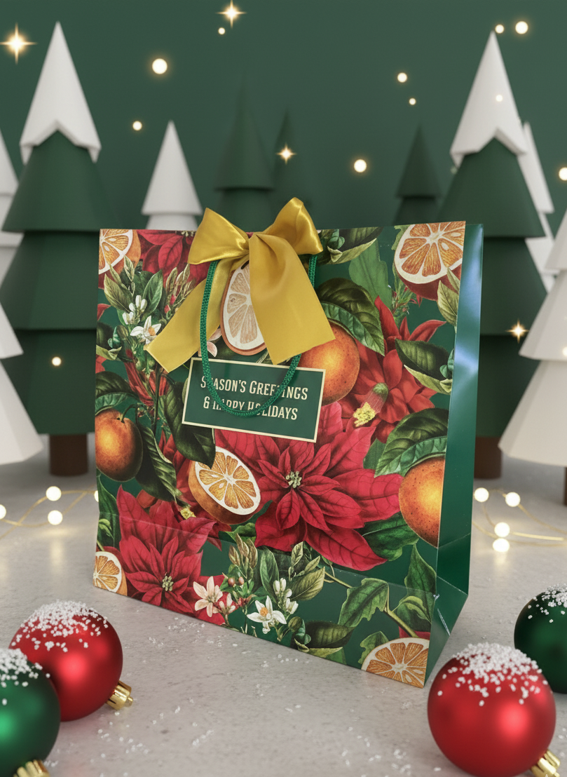 🛍️ 5 Evergreen Bags  — measuring 30 × 13 × 30 cm, these multipurpose gift bags fit everything from candles and cookies to books, apparel, and small hampers. Text on the bag: "Season's Greetings and Happy Holidays"