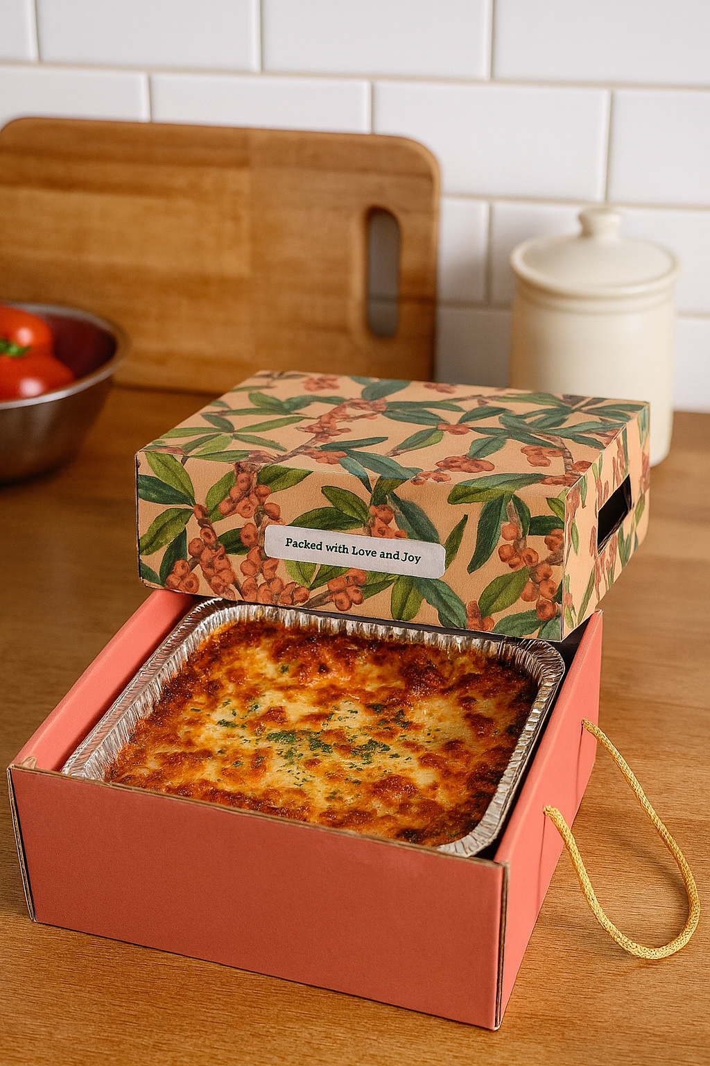🎁 5 Noel Boxes — sized 21 × 21 × 10 cm, the perfect fit for four mini cookie jars, festive hampers, or hearty homemade dishes like lasagna and rice platters. Text on the box: "packed with love and joy"